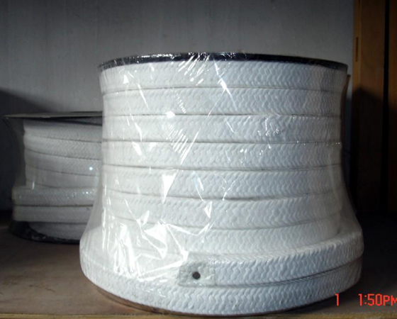 聚四氟乙烯盤根簡(jiǎn)稱四氟盤根是以聚四氟乙烯分散樹脂為原料,先制成生料薄膜,再捻制成線,用盤根機(jī)編織成盤根,該盤根不需要浸漬任何添加物,可廣泛用于食品、造紙、制藥、精細(xì)化工等潔凈度要求高的泵閥上。